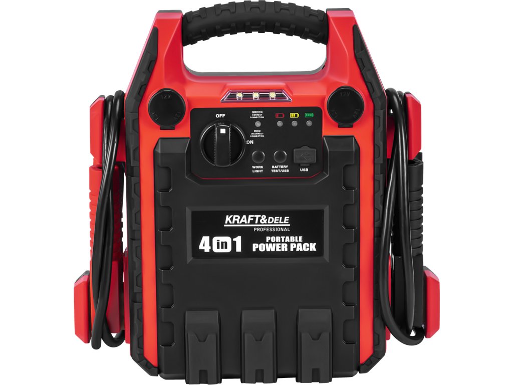 Multifunkční zařízení Kraft&Dele KD5346 představuje ideální řešení pro každého řidiče i outdoorového nadšence. Kombinuje výkonný jump-starter, kompresor na pneumatiky, powerbanku a praktické LED osvětlení v jednom kompaktním a robustním těle. Díky vysoké kapacitě baterie 22Ah a maximálnímu startovacímu proudu 1200A zvládne nastartovat většinu vozidel s 12V instalací včetně osobních automobilů, motocyklů a rekreačních strojů. Vestavěný kompresor s tlakem až 11 bar umožňuje rychle dofouknout pneumatiky a vestavěný manometr zaručuje přesné měření tlaku. Napájecí výstupy – dvě 12V zásuvky a USB port 5V/2,4A – zpříjemní cestování a nabití elektroniky v terénu. Tři silné LED diody poskytují dostatečné osvětlení pracovního prostoru i za tmy. Ergonomické držadlo a inteligentní ovládací panel pak usnadňují manipulaci i použití v náročných podmínkách.- Multifunkční zařízení 4v1 jump-starter: kombinace startování, kompresoru, powerbanky a osvětlení.