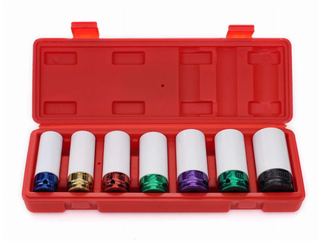 - 7 ks 1/2" nástrčných rázových hlavic v různých velikostech: 17 mm, 19 mm, 21 mm, 22 mm, 23 mm, 24 mm, 27 mm.