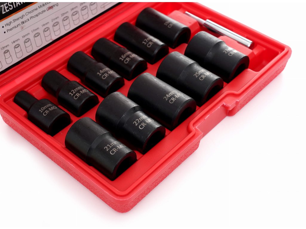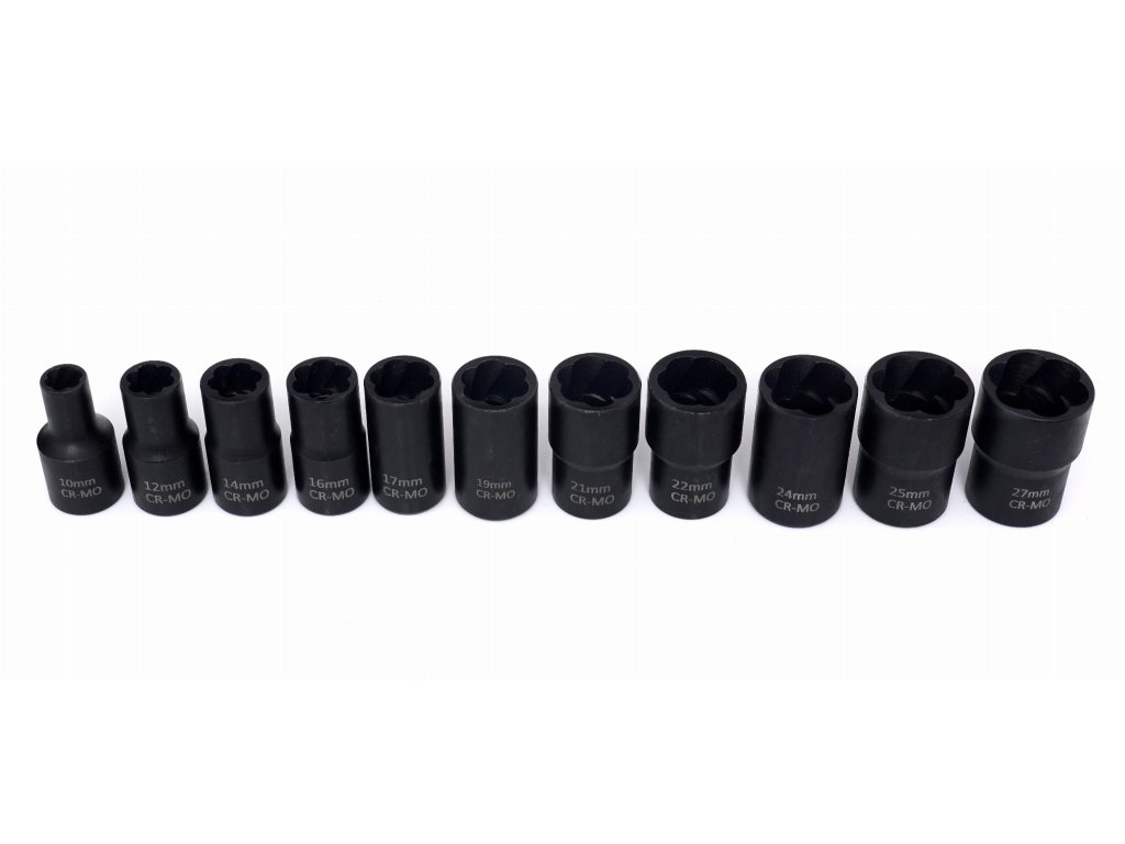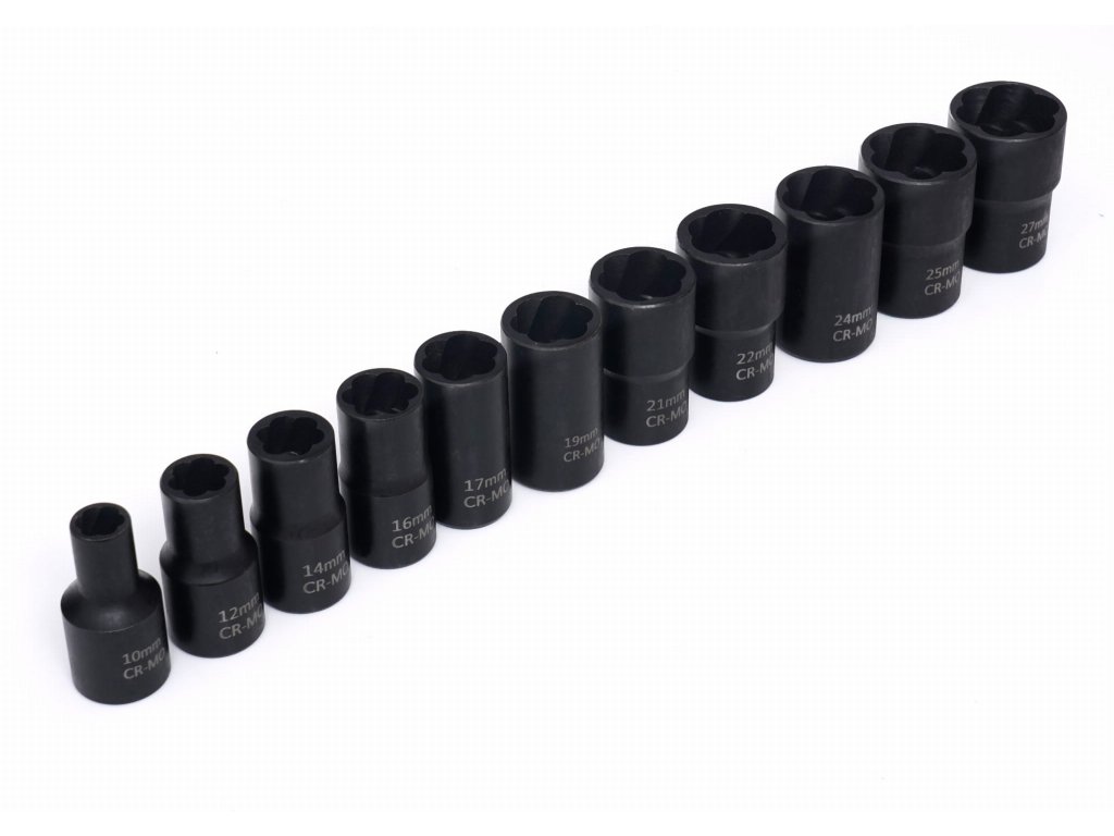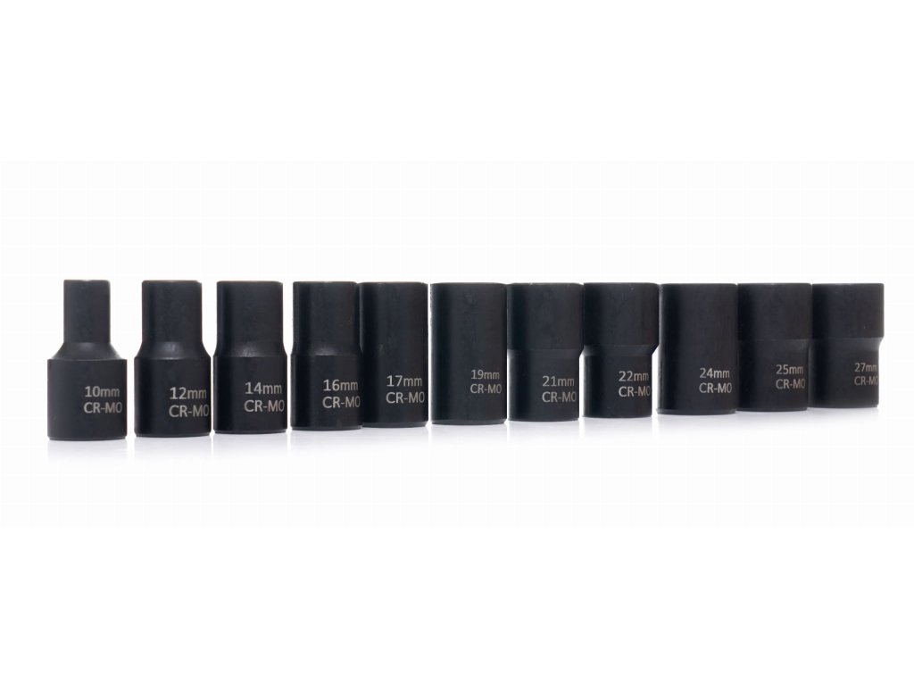 - 12 nástrčných hlavic o velikostech: 27 mm, 25 mm, 24 mm, 22 mm, 19 mm, 17 mm, 16 mm, 14 mm, 12 mm, 10 mm.
