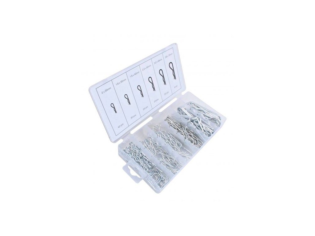 - Sada pružinových kolíků: 150 kusů různých průměrů od 2 do 3,8 mm.